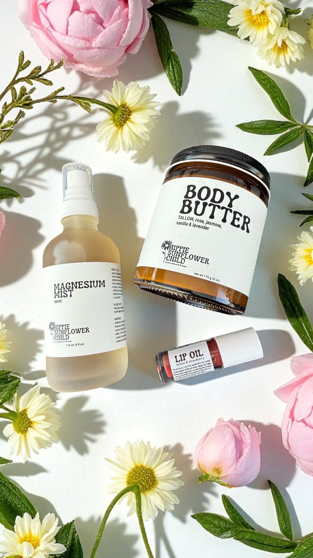 Here at Hippie Sunflower Child, we believe that skincare should be simple, clean and effective. Our products are handmade in small batches with love, using only the highest quality ingredients. We believe in using only natural, organic and wildcrafted ingredients that are ethically sourced and environmentally sustainable. Our products are cruelty free, non-toxic and eco friendly. Nature has the power to heal, nourish and revitalize the skin. We believe that beautiful skin starts from within. We hope you enjoy our products as much as we enjoy making them!