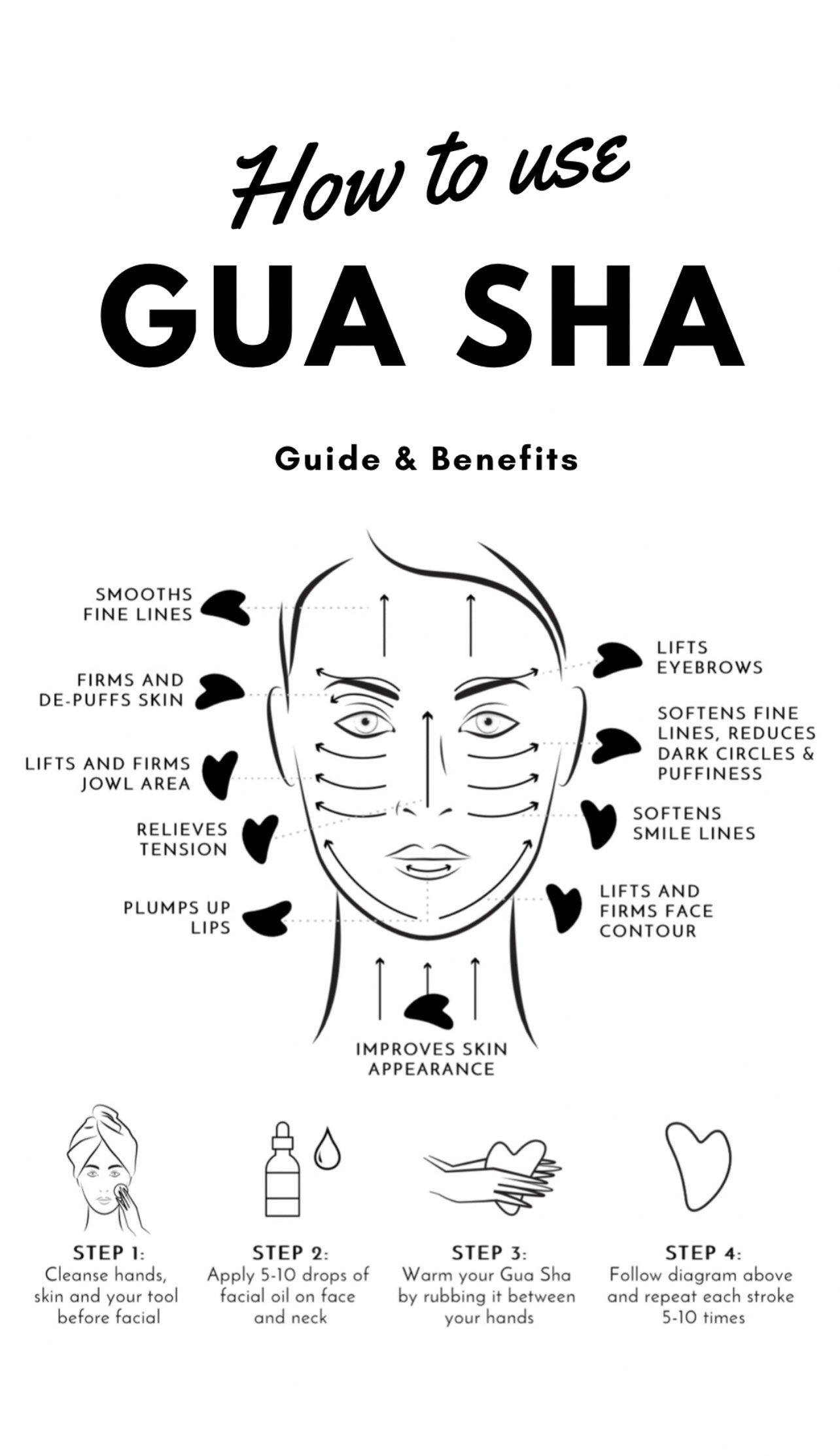 - Face Massage: Hold the Gua Sha stone at a 15-degree angle to your skin. Begin at the neck, gently stroking upwards and outwards. Move to the jawline, cheeks, and under-eye area, always stroking upwards and towards the ears or hairline. Use the stone’s edges to sculpt and contour.