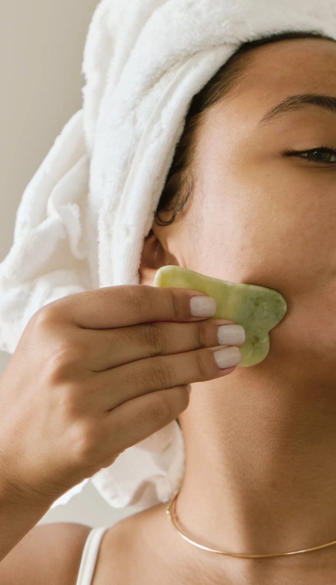 - Forehead and Brow: Use the flat side of the stone to sweep upwards on your forehead, and gently glide it across your brow bone to relieve tension.